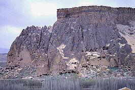 volcanic area with ancient cliff dweller homes on horizont