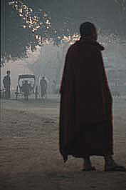 monk waiting for horse-coach in the morning, Bagan