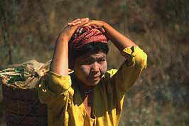 woman with vegetables-basket on way to market, Kalaw hills