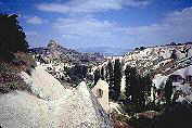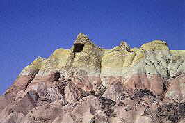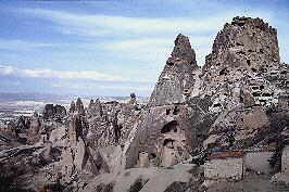 volcanic area with ancient cliff dweller homes on horizont